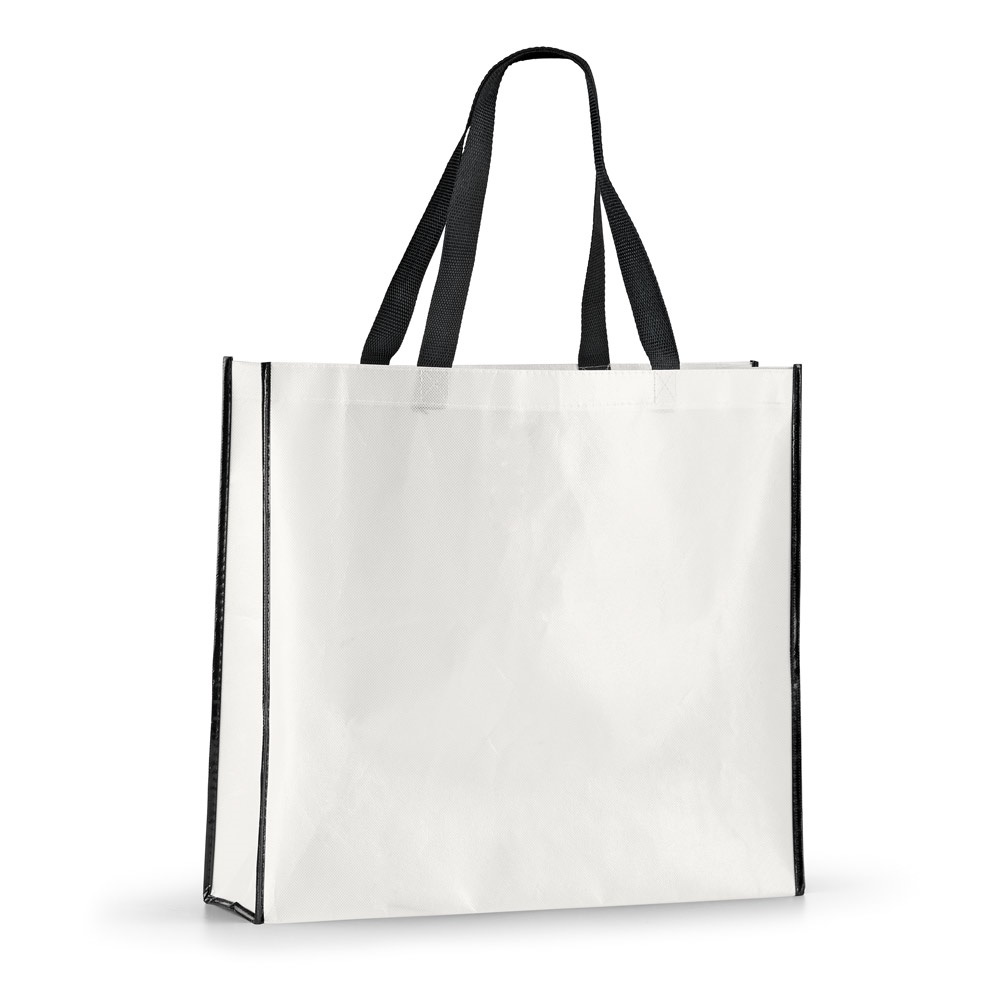 Non-woven laminated bag (120 g/m²) with 60 cm webbing handles and glossy lamination. 420 x 380 x 120 mm