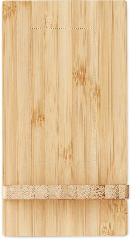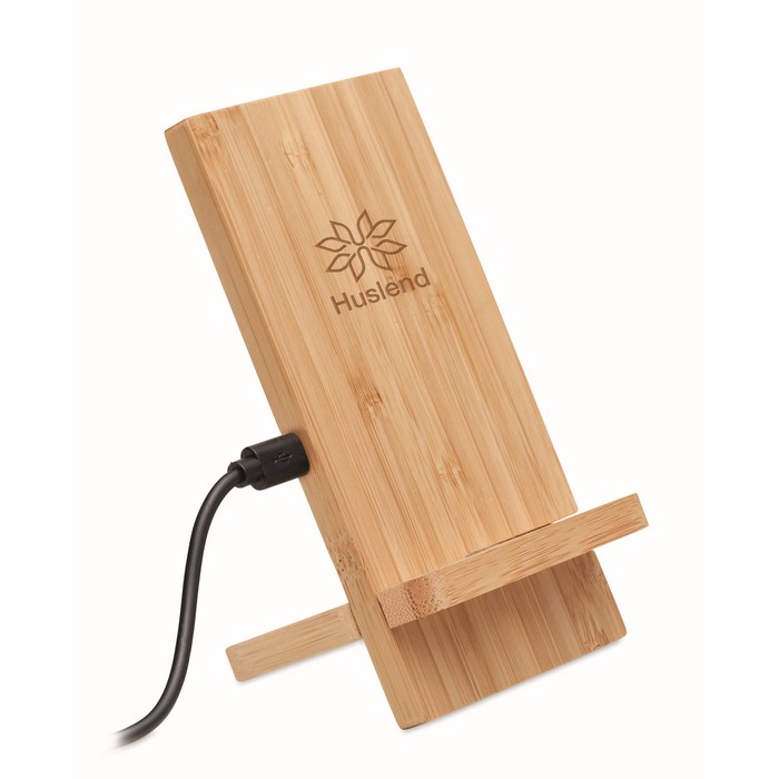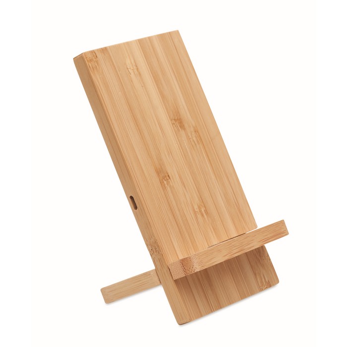 Double coil wireless charger stand in bamboo. Place smartphone on it to begin charging. It includes 2 parts, assembly required. Output: DC 9V/1.1A (10W) for quick charging. Compatible with latest Androids, iPhone® 8, X and newer.