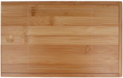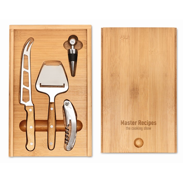 Bamboo cheese and wine set. Includes a stainless steel-knife, cheese peeler, bottle opener and wine stopper. Presented in bamboo box.