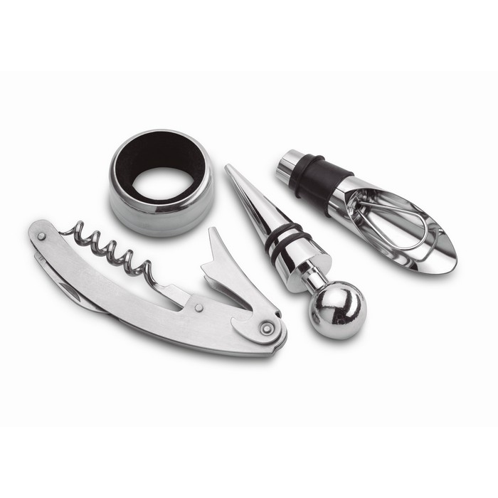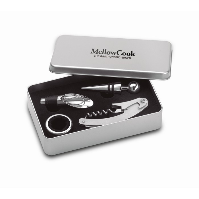 Wine set including bottle opener, stopper, pourer and anti-drip ring presented in tin box.