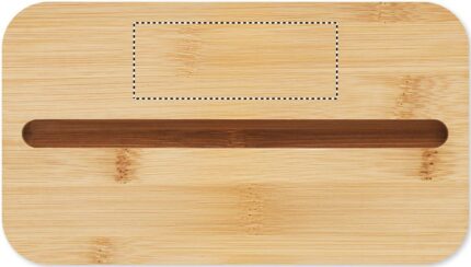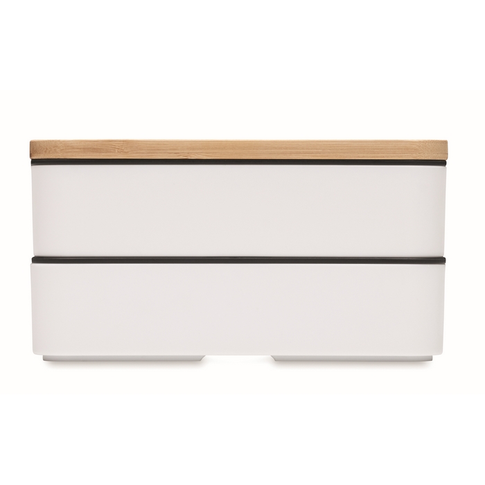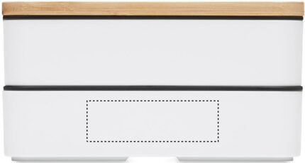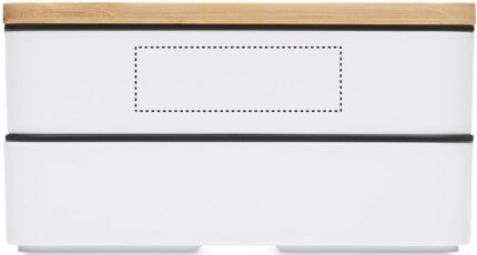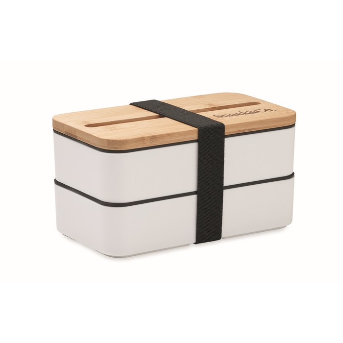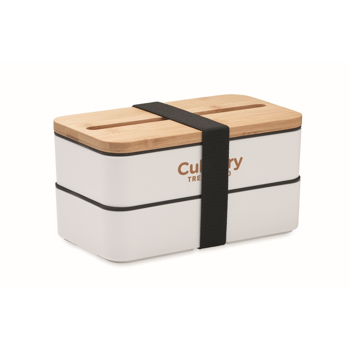 Recycled PP two-tier lunch box with removable divider and 3 cutlery utensils with attachable polyester band with bamboo lid. The lid has a phone stand functionality. Capacity: 400 ml (2x). Bamboo is a natural product, there may be slight variations in colour and size per item, which can affect the final decoration outcome.