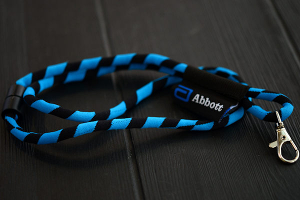 Ένα λευκό και μπλε Woven Round Lanyards Προσαρμόστε το σε ένα τραπέζι.