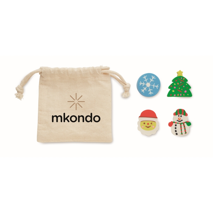 Το σετ RUBBIES περιλαμβάνει τέσσερις διαφορετικές γόμες σε σχήμα νιφάδας, Άγιου Βασίλη, χριστουγεννιάτικου δέντρου και χιονάνθρωπου, τοποθετημένες σε ένα χαριτωμένο βαμβακερό σακουλάκι με κορδόνι. Ιδανικές για την εορταστική περίοδο καθώς οι γόμες προσθέτουν μια χαρούμενη πινελιά στις σχολικές εργασίες και τα καλλιτεχνικά έργα.