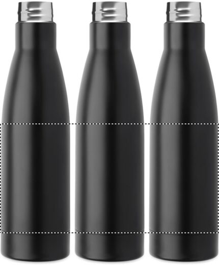 Luxury 3 piece gift set. It includes an A5 notebook with hard RPET cover. Casebound. 160 lined recycled paper pages (80 sheets). Matching elastic closure strap and ribbon page-marker and pen holder. Matching twist ball pen. Double wall stainless steel vacuum insulated bottle. Capacity: 500 ml. Presented in a luxury gift box.