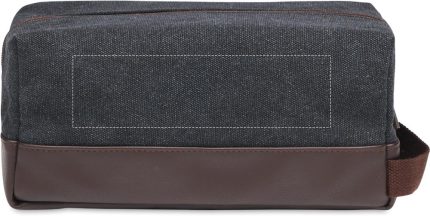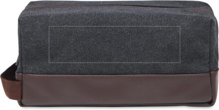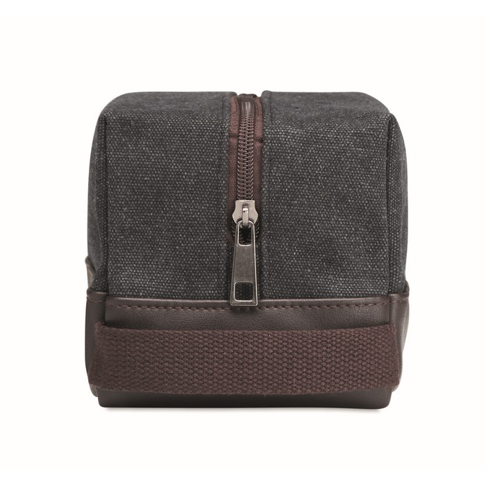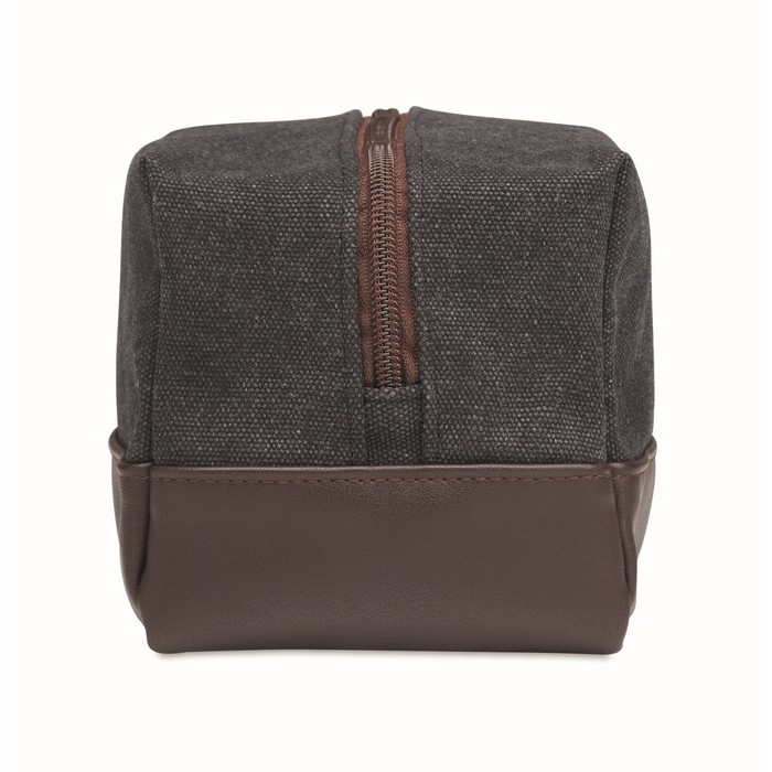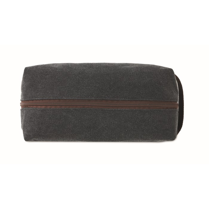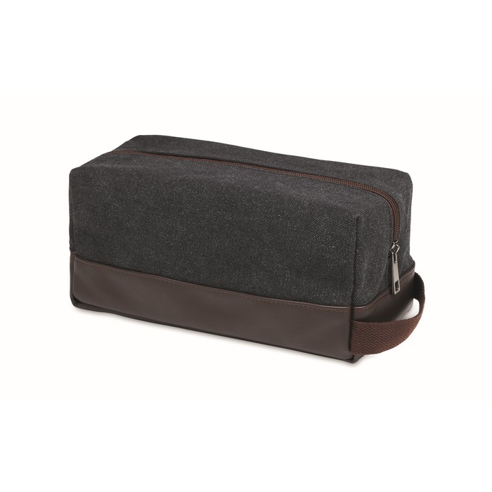 Cosmetic bag with one zipper in high quality 450 gr/m² washed canvas. Lining is in RPET 210D. Side handle and bottom in recycled PU.